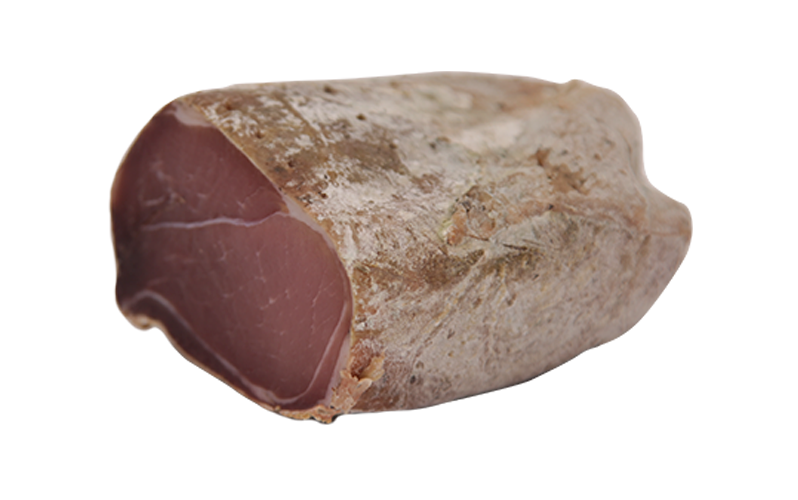 Porc élevé à Massat en Ariège. Noix de jambon tendre, séchée et légèrement fumée