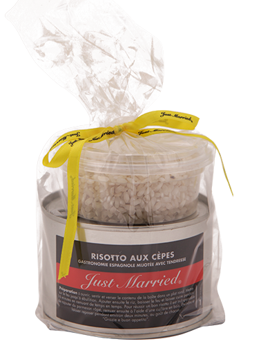 Risotto espagnol gastronomique : cèpes, potiron-asperge, encre de sèche. Portion individuelle.