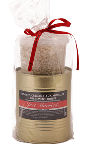 Risotto espagnol gastronomique : morilles légèrement truffées, jambon ibérique et foie gras. Portion pour 2-3 personnes.