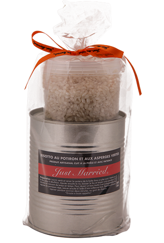 Risotto espagnol gastronomique : cèpes, potiron-asperge, encre de sèche. Portion pour 2-3 personnes.