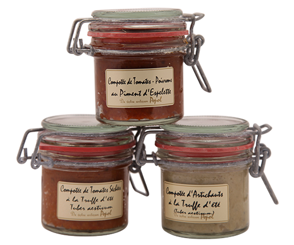 Artisan fabricant des produits typiques provençaux, uniquement à base de poduits frais et arômes naturels. Trois parfums de compotée : tomates et poivrons au piment d'espelette, tomates séchées à la truffe d'été, artichaut à la truffe d'été.